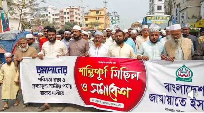 পবিত্র রমজান মাসের আগমন উপলক্ষে রমজানকে স্বাগত জানিয়ে, রমজানের পবিত্রতা রক্ষা ও দ্রব্যমূল্য সহনশীল পর্যায়ে রাখার দাবিতে এক বিশাল শান্তিপূর্ণ মিছিল বের করে জামায়াতে ইসলামী লাকসাম উপজেলা ও পৌরসভা শাখা।