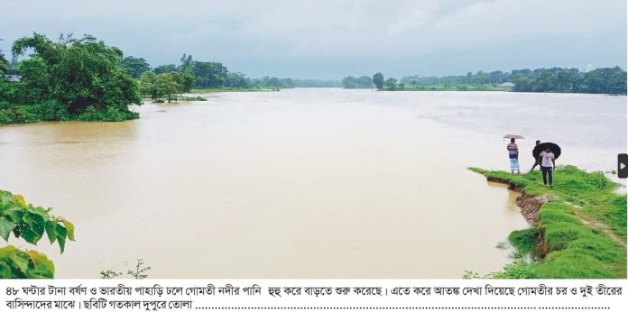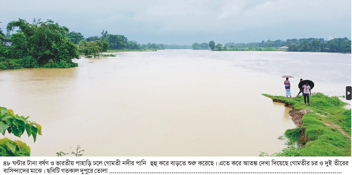 ৪৮ ঘন্টার টানা বর্ষণ ও ভারতীয় পাহাড়ি ঢলে গোমতী নদীর পানি পানি হু হু করে বাড়তে শুরু করেছে। এতে করে আতঙ্ক দেখা দিয়েছে গোমতীর চর ও দুই তীরের বাসিন্দাদের মাঝে। গেলো বছরের আগস্টে স্মরণকালের ভয়াবহ বন্যায় গোমতীর বাঁধ ভেঙ্গে পাশে তিন উপজেলা প্লাবিত হয়ে যাওয়ার ফলে এবার পানি বাড়তে থাকায় সে শঙ্কা আরো বেড়েছে।