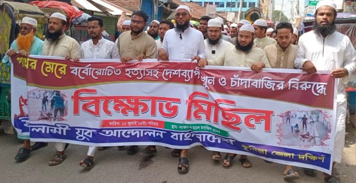 পাথর মেরে মানুষ হত্যা দেশব্যাপী খুন ও চাঁদাবাজির বিরুদ্ধে লাকসামে বিক্ষোভ মিছিল