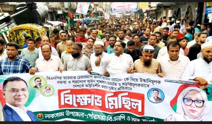 বিএনপির ভারপ্রাপ্ত চেয়ারম্যান, জনগণের আস্থার প্রতীক ও গণতন্ত্র পুনরুদ্ধার আন্দোলনের অগ্রভাগের নেতা জনাব তারেক রহমানকে উদ্দেশ্য করে চরমোনাই পীরের অশালীন, উদ্দেশ্যপ্রণোদিত এবং অমার্জনীয় মন্তব্যের তীব্র নিন্দা ও প্রতিবাদ জানিয়েছে লাকসাম উপজেলা ও পৌরসভা বিএনপি।