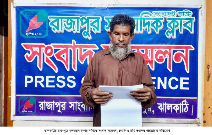 ঝালকাঠির রাজাপুরের ঘিগড়া গ্রামে পৈত্রিক কবরস্থান রক্ষা, প্রভাব খাটিয়ে জমিতে চাষাবাদ ও কবরস্থানের জায়গা জমি দখলের পায়তারার অভিযোগ প্ওয়া গেছে। শনিবার সকালে রাজাপুর সাংবাদিক ক্লাবে উপজেলার ঘিগড়া গ্রামের মৃত আকরাম হোসেন তালুকদারের ছেলে ভুক্তভোগী মোঃ হান্নান তালুকদার সংবাদ সম্মেলনে লিখিত বক্তব্যে অভিযোগ করে জানান, তার পিতা মৃত আকরাম হোসেন তালুকদারের নামে থাকা জমিটিতে পূর্ব পুরুষ তবাতুল্লা তালুকদারের কবরস্থান হিসেবে বহু বছর ধরে ব্যবহার হয়ে আসছে। ওই জমির মালিকানা নিয়ে ২০১৯ সাল থেকে দেওয়ানি মামলা (নং ৩১/২০১৯) চলমান রয়েছে। যার ওপর আদালতের অস্থায়ী নিষেধাজ্ঞা জারি রয়েছে।