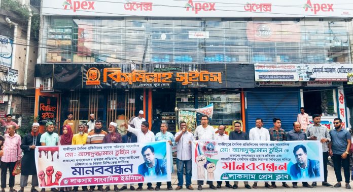 মানববন্ধনে লাকসামের বিভিন্ন গণমাধ্যমকর্মী, সামাজিক ও সাংস্কৃতিক সংগঠনের প্রতিনিধিরা উপস্থিত ছিলেন।