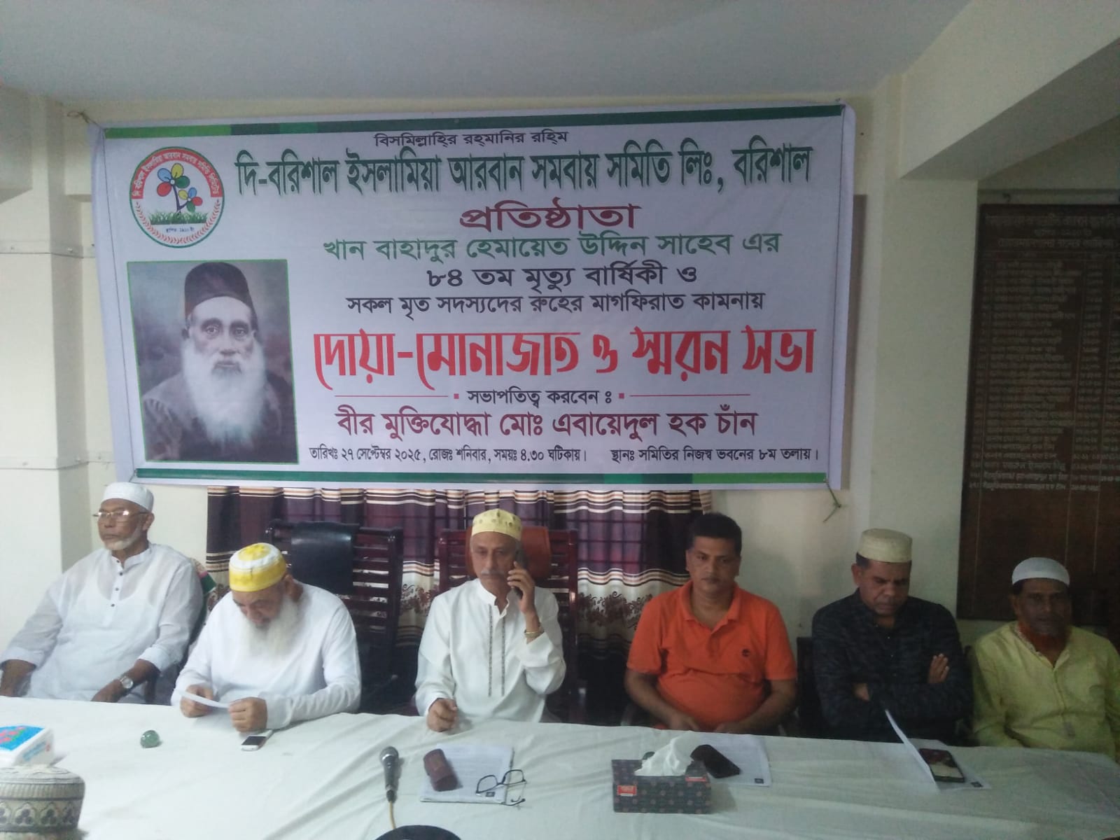 শনিবার (২৭ সেপ্টেম্বর) আসরবাদ ‘দি-বরিশাল ইসলামিয়া আরবান সমবায় সমিতি লিঃ’ এর আয়োজনে অফিস কার্যালয়ে নগরীর সদর রোডে হোটেল কিং ফিশারে এ খান বাহাদুর হেমায়েত উদ্দিন এর ৮৪তম মৃত্যু বার্ষিকী ও সকল মৃত সদস্যদের রুহের মাগফেরাত কামনায় দোয়া-মোনাজাত ও স্মরণ সভা অনুষ্ঠানে সভাপতির বক্তব্যে এবায়েদুল হক চাঁন উপরোক্ত কথাগুলো বলেন। স্মরণ সভায় দোয়া-মোনাজাত করেন- বরিশাল জামে এবাদুল্লাহ মসজিদের সম্মানিত খতিব আলহাজ হজরত মওলানা মীর্জা নুরুর রহমান বেগ।