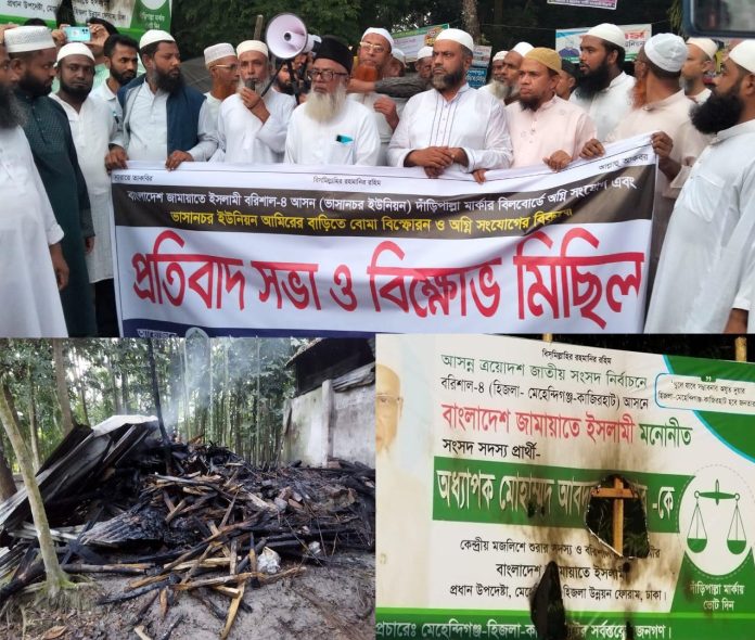 মেহেন্দিগঞ্জে জামায়াতের এমপি প্রার্থীর বিলবোর্ডে আগুন, ইউনিয়ন আমীরের বাড়িতে অগ্নিকাণ্ড : প্রতিবাদে বিক্ষোভ