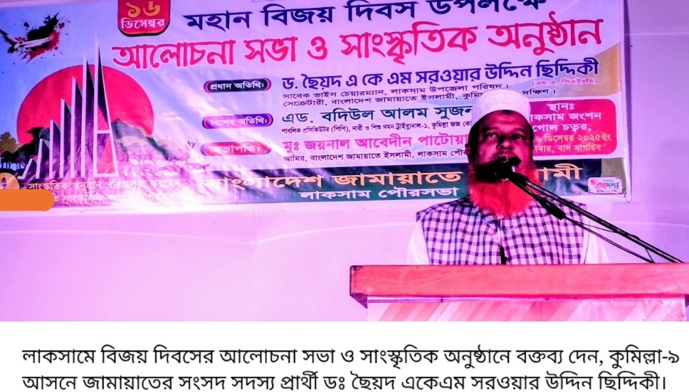 কুমিল্লার লাকসাম জংশন চত্বরে মহান বিজয় দিবস উপলক্ষে আয়োজিত আলোচনা সভা ও সাংস্কৃতিক অনুষ্ঠানে প্রধান অতিথির বক্তব্যে ডঃ ছৈয়দ একেএম সরওয়ার উদ্দিন ছিদ্দিকী এসব কথা বলেন।